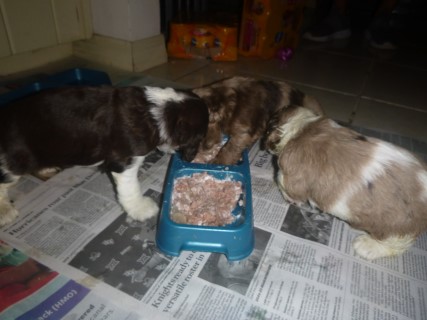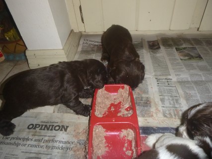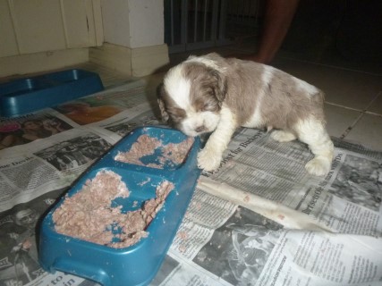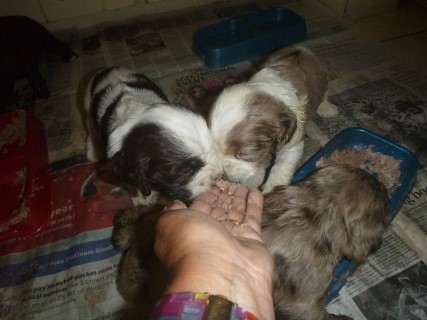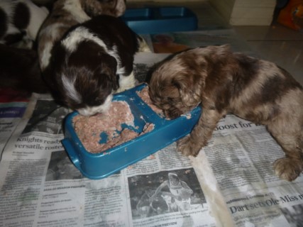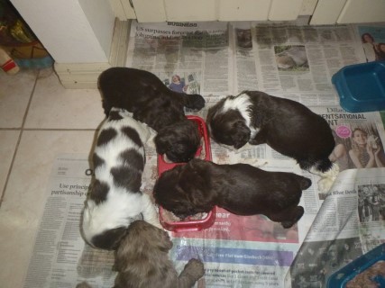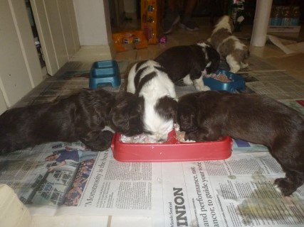 | Pups saw the vet for a checkup at 4 days old. He docked tails and removed dew claws at this visit as well. New pictures below are of their first solid meal! We will be taking the next set at about 6 weeks old - glamour shots! | ||