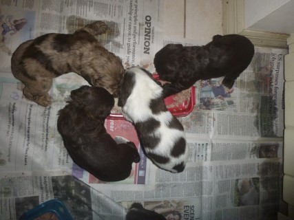 This is Juliet's first litter! She is such a beautiful colored cocker - Chocolate with tan markings and merle! Just look at the freckles on her face! |