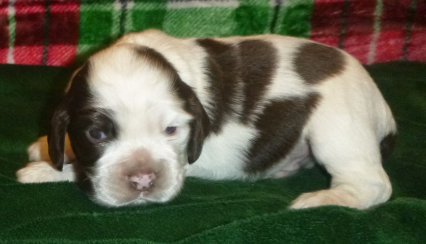 above - I'm puppy #4 from Juliet's litter - male. I'm parti with chocolate markings, more chocolate than white