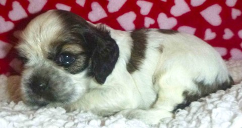 Puppy #1 - female parti sable, likely roan red collar |