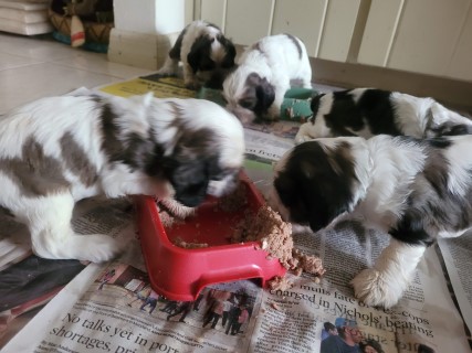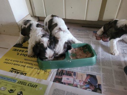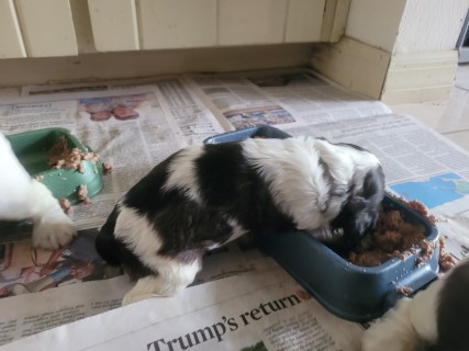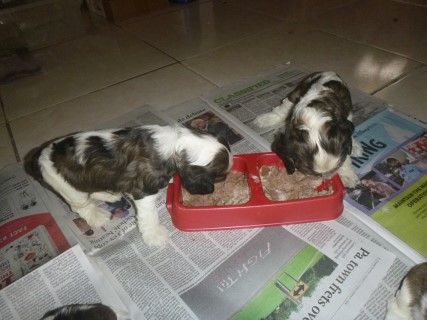 | At about 3.5 weeks old, the pups have their first taste of solid food - pedigree can puppy food mixed with formula. It is always a fun meal to watch! | |