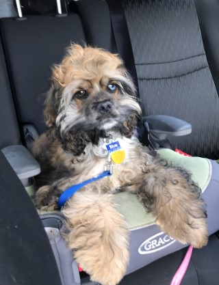 Blue is an energetic sweetheart. He loves to ride in his puppy seat in the car and go on vacation! Of course I sleep right next to Mommy at night. With my looks, I get everyones attention cause I’m adorable!!