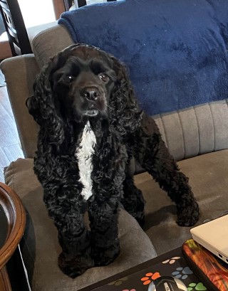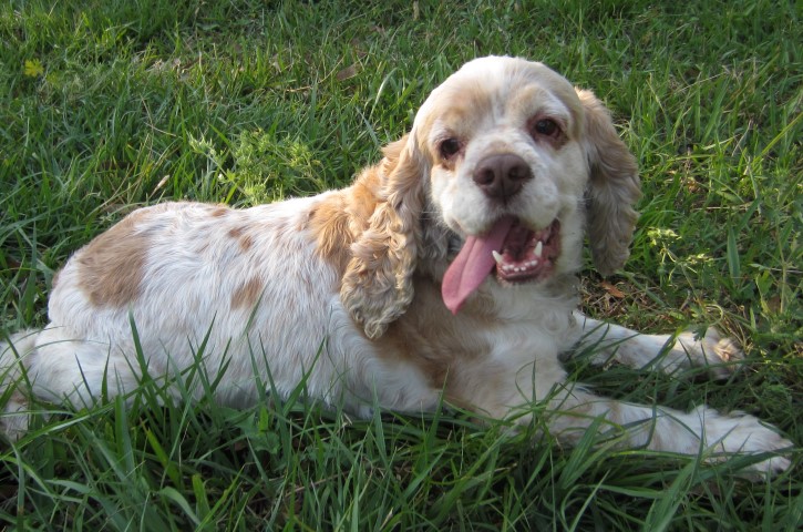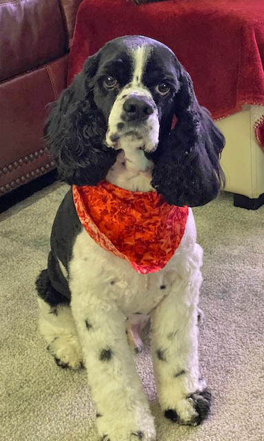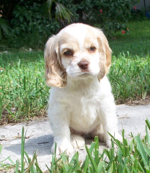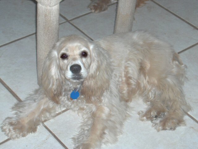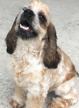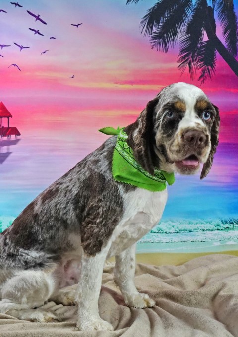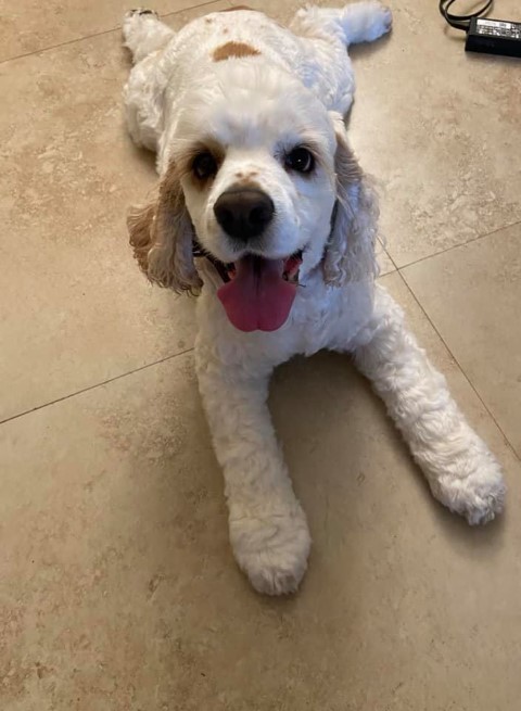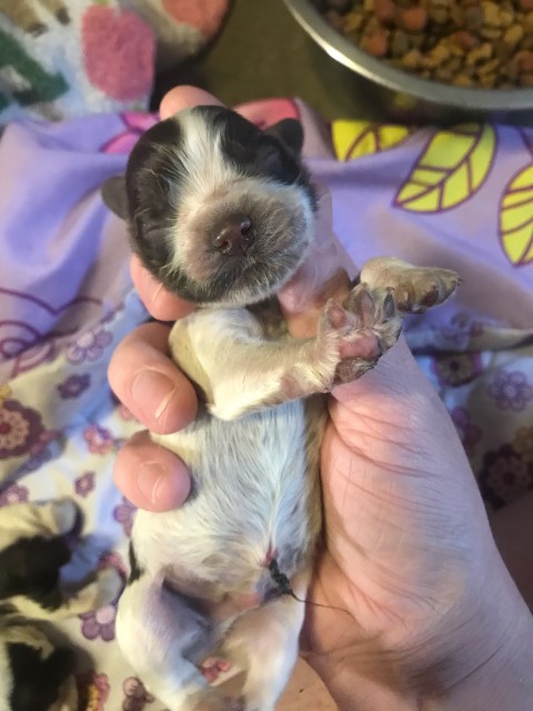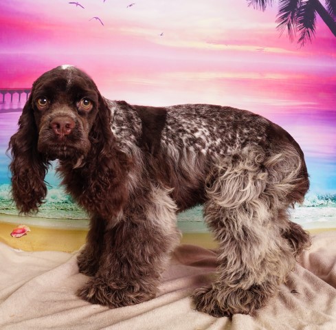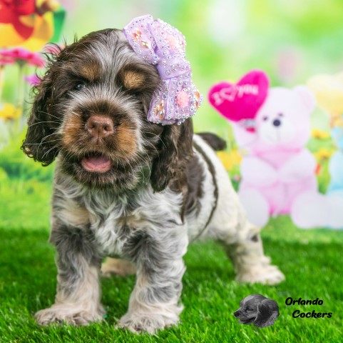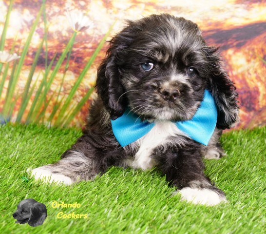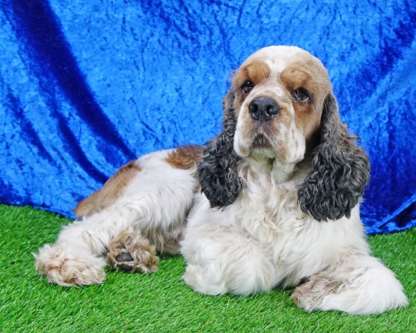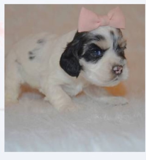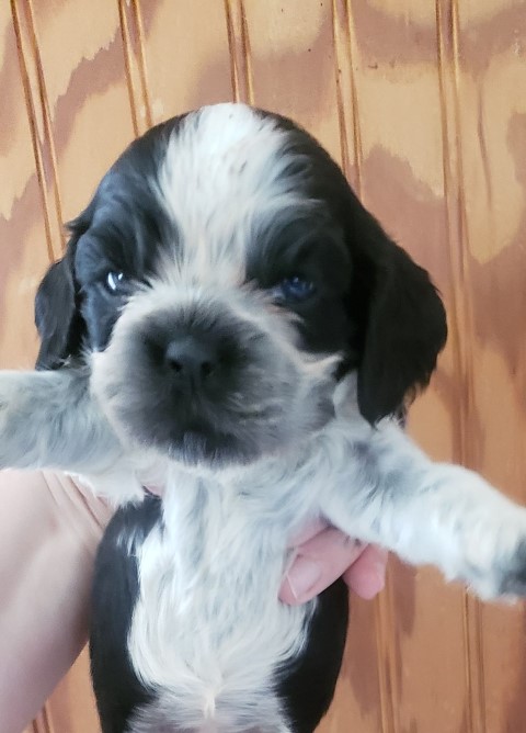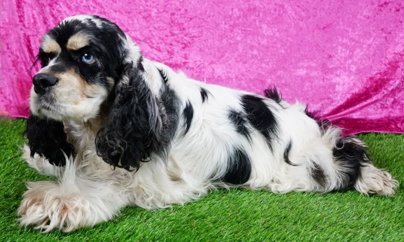 Shown is our Keiki – you can see her white areas do not look white as an adult. It looks grey, called blue in a cocker. She is from a breeder in South Carolina