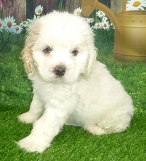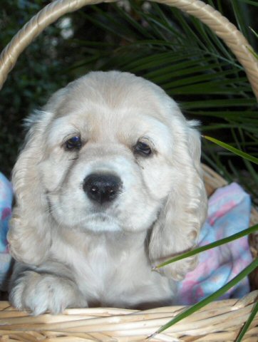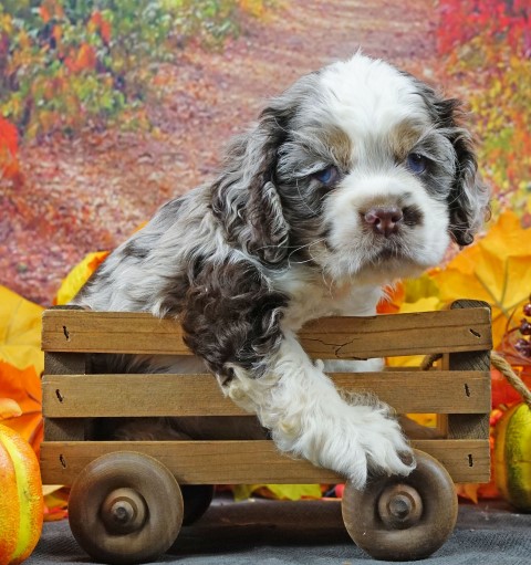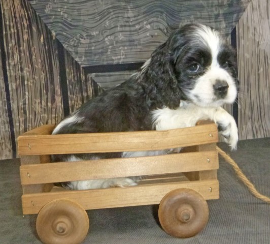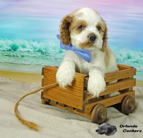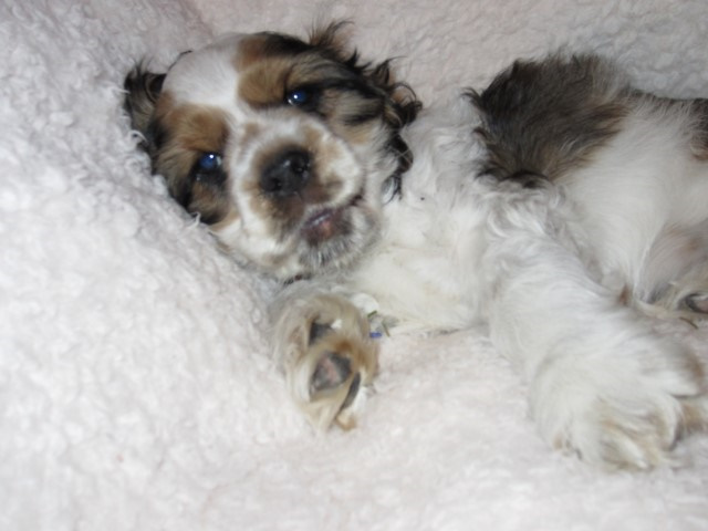 Parti (white) – it simply means large areas of white on the pup. This sweet boy is one of the most beautiful near full white cockers we have ever had.