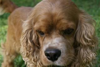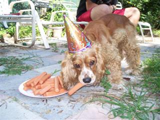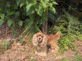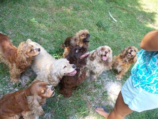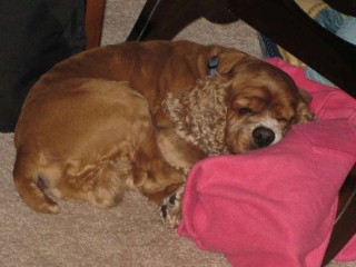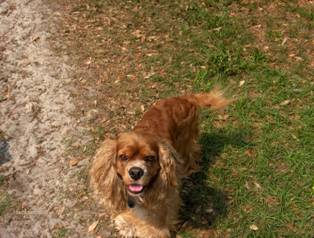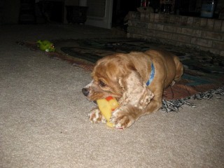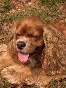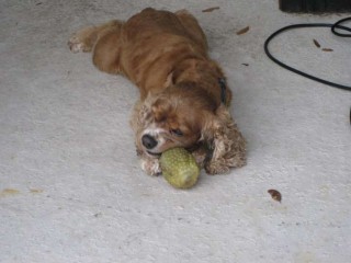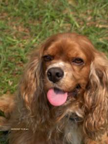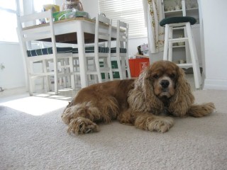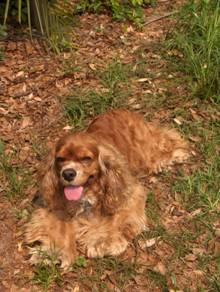 Coco came to us from a breeder in Raleigh, North Carolina born on 3/27/2003. He was our first male cocker! He loves having his belly rubbed and following his owners everywhere! Coco loves to chase a ball when you throw it or a lizard scrambling on the grass. He has chocolate brown eyes, and a long haired, curly red coat with white markings on his chest and nose. Coco stayed with us and fathered many litters until he retired at 9 years old.
