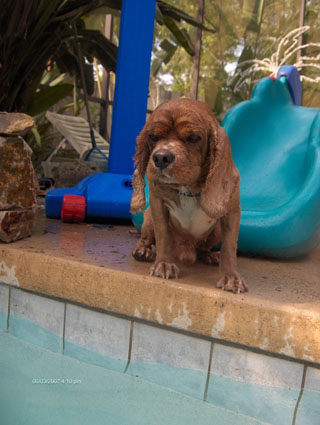 Coco LOVES to jump after toys – even going under water to find them! Some pics of him playing in the pool!