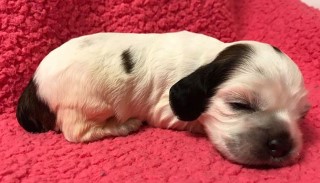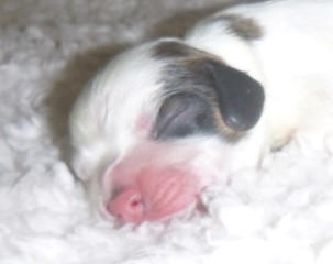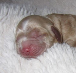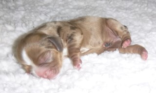 Merle gene dilutes color in areas that ARE NOT white. Black becomes blue and Chocolate becomes tan. Merle color is seen at birth. Many merle pups have a partial or full blue eye, maybe 2 blue eyes. Sometimes a freckle in the eye. Merle pups can be parti (areas of white fur) – these areas stay white!