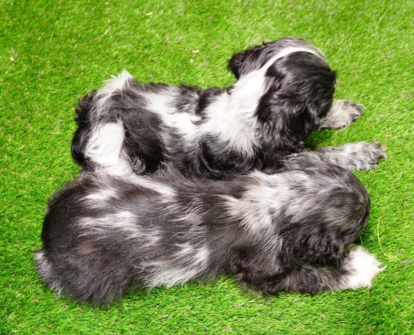 Comparison of roan and merle pup together – both blue (black) colored: