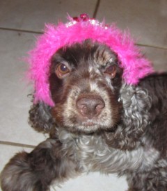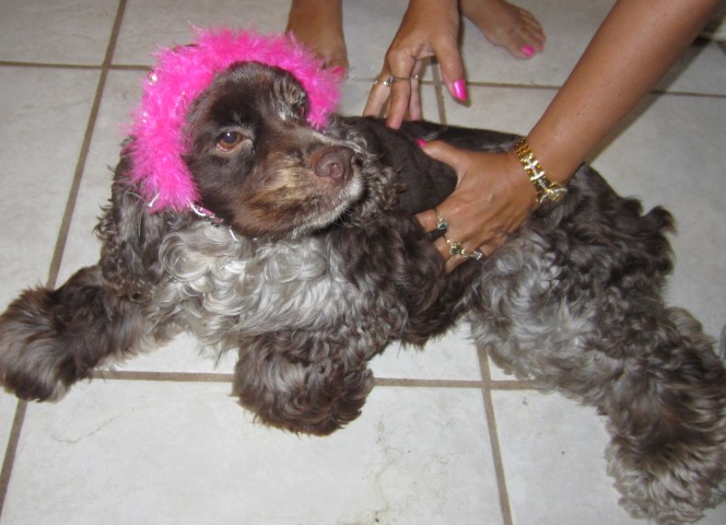 Leilani joined us in September 2010. She came from a breeder in South Dakota. Pictures of her parents are shown below. She is such a rare cocker – her coat is called Chocolate Merle. It almost seems like someone took a paint brush and dotted her coat with several colors of brown! LeiLani had an injury at age 3, and she was retired early. She has found a great family in Florida.