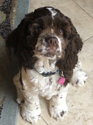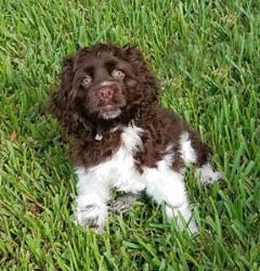 Stella – chocolate and white cocker – Parents Patty and Chip born 7-14-20 – shown at 1 and 2 yrs old.