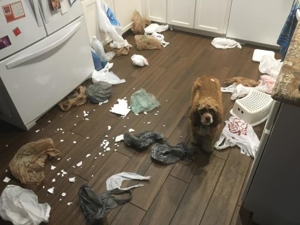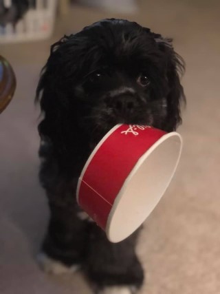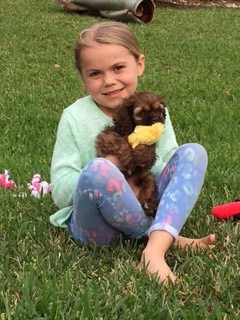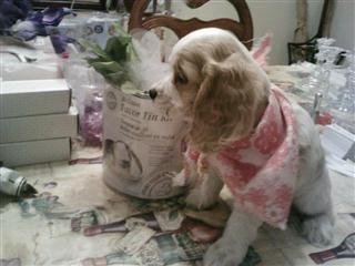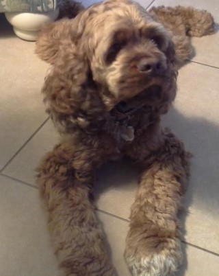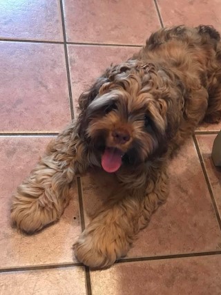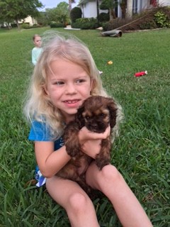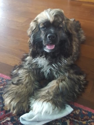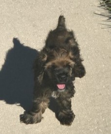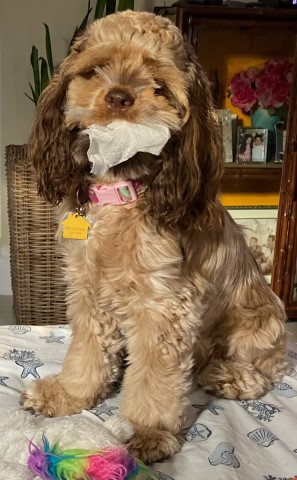 Molly – chocolate sable cocker – Calypso is the mom, Bandit the Dad, born 6-23-19 – and No, I did not make this mess…shown as 6 months and 2 yrs old