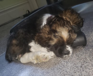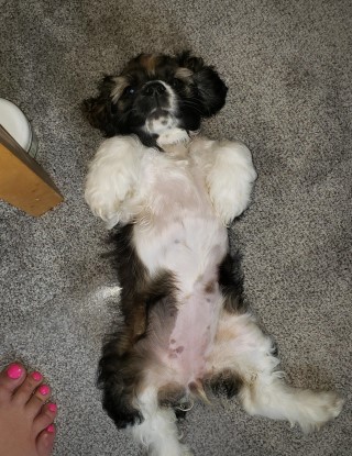 Ziggy -very open marked parti pup! Lily is the mom, Bolt the Dad, born 6/23/17