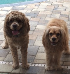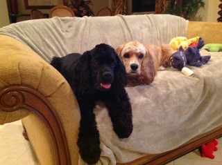 Cuatro and Cinco together – Cuatro is a buff colored cocker – Bella is the Mom, Coco is the Dad, born 10/11/09. Cinco joined Cuatro a year later. Cinco is a chocolate sable pup – Jasmine as the mom, Coco the Dad, born 8/7/10. Cinco was a guest stud for some of our litters!