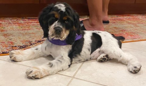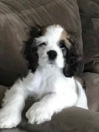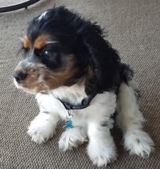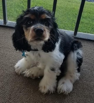 Baxter – black and white cocker with tan markings – Blue is mom, Bandit is Dad born 9-10-18