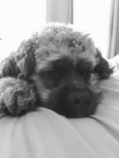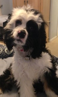 Violet, a silver St. Jame Cocker. Chloe is the Mom, Taz the Dad. Born 11/27/13