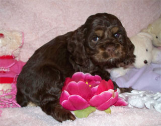 Bella – Chocolate cocker with red highlights – Jasmine is the Mom, Coco is the Dad, born 12/23/09