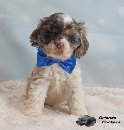 Kaillo – a future stud with Orlandocockers! Chocolate sable merle parti cocker. Patti is the Mom, Bandit the Dad. Born 11/26/19