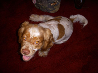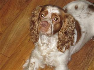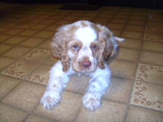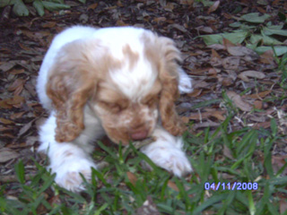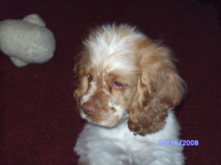 Levi -White parti colored cocker with the liver gene (brown nose, green eyes) – Alexis is the Mom, Jesse is the Dad, born 1/28/08(shown here at 3 months,10 months and 4 yrs)