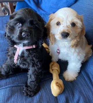 Rosie – black cocker and Sophie – parti cocker sisters born from Calla and Bandit – born 1/8/20