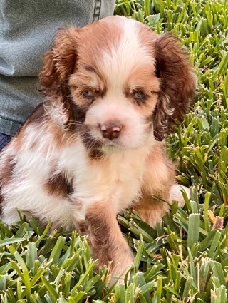 Siena chocolate merle parti cocker – Blue and Boti are the parents born 1/25/20.