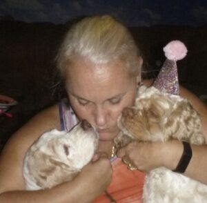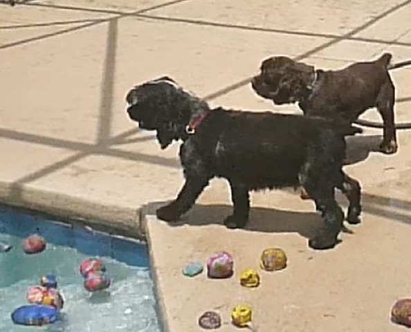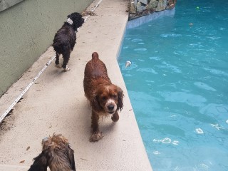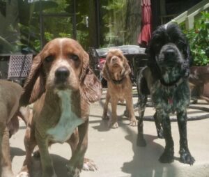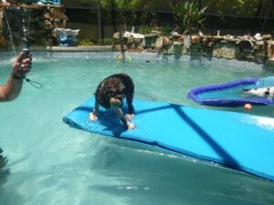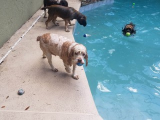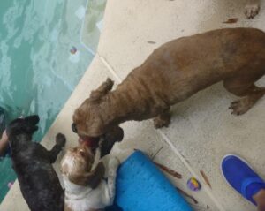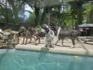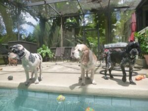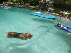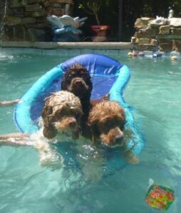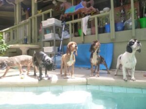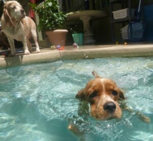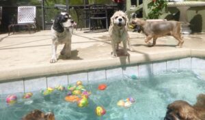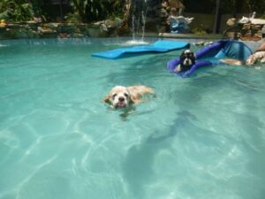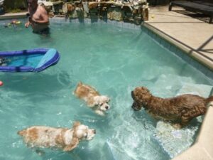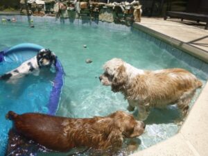 2014 – July – pool time! Toddlers Patti, Daisy and Cheri love the pool! Also pictured are Willow, Taz and Roxy
