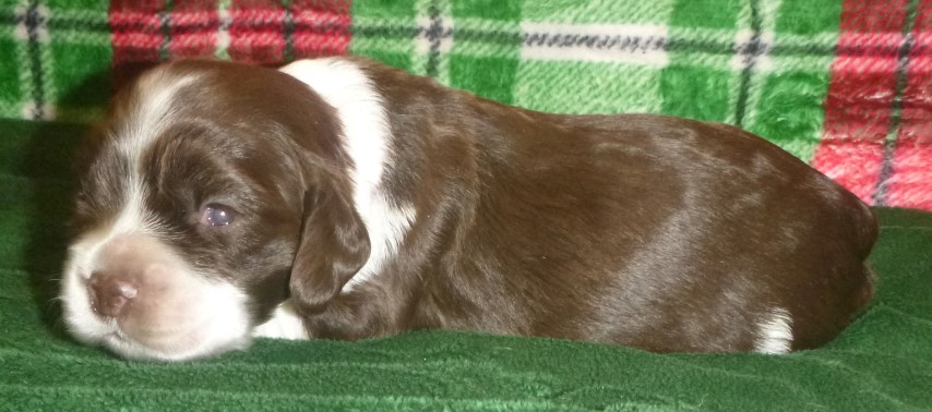 above - I'm puppy #3 from Juliet's litter - male. I'm parti with chocolate markings. More white than chocolate