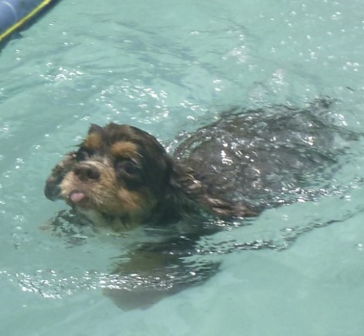 Lani is not a huge swimming dog but when it is hot and toys are involved, she will definitely take a few laps to swim after a water bomb ball! Here she is at 5 years old.