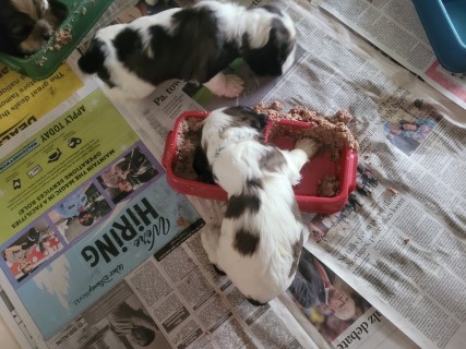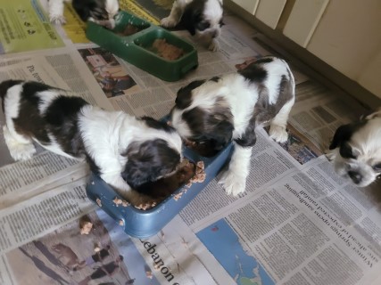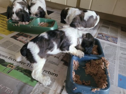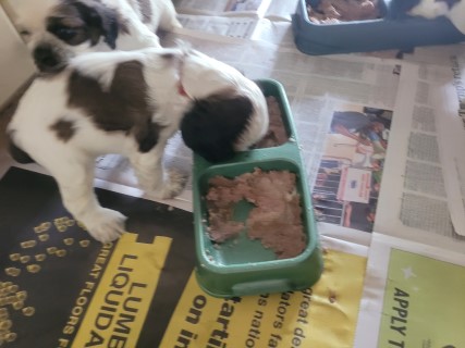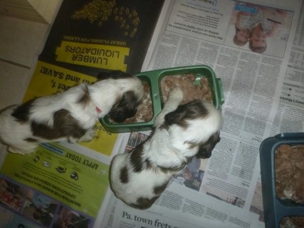 | At about 3.5 weeks old, the pups have their first taste of solid food - pedigree can puppy food mixed with formula. It is always a fun meal to watch! | |