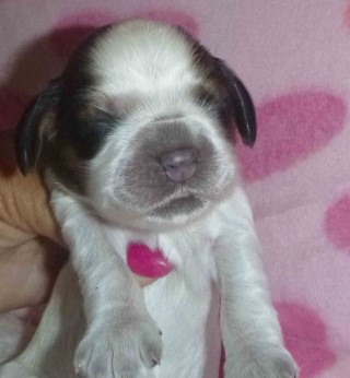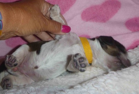 Puppy #2 - female parti sable, likely roan yellow collar |