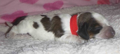 Puppy #1 - female parti sable, likely roan red collar |